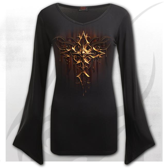 Dripping Gold, Trumpettihiha. Musta goottityylinen pitkähihainen trikoopaita. Edessä printti ja hihansuut levenevät trumpettimaisena. V-mallinen pääntie. Materiaali 95 % viskoosi ja 5 % elastaani.