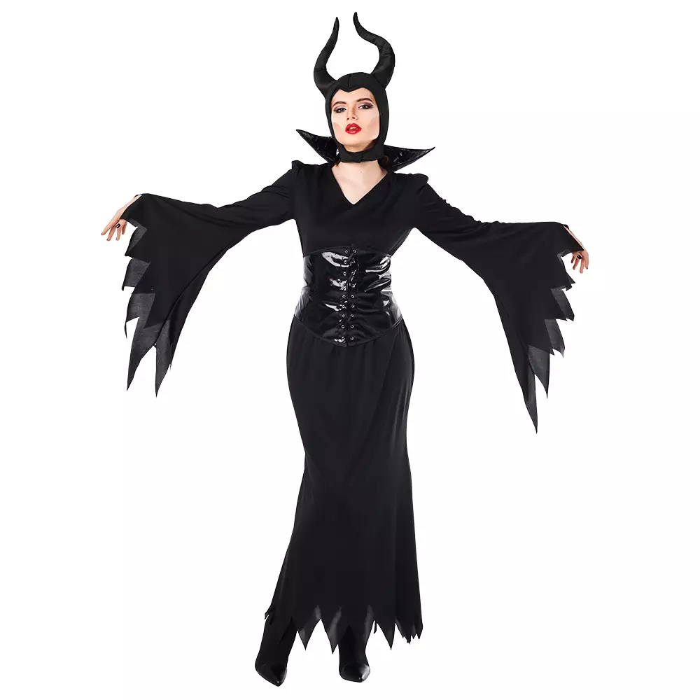 Evil Queen, koko M/L naamiaisasu, Halloween. Musta, tyylikäs naispahiksen asu naamiaisiin. Asuun kuuluu isokauluksisen mekon lisäksi sarvipäinen huppu, sekä korsetti. Materiaali 100 % polyesteri.