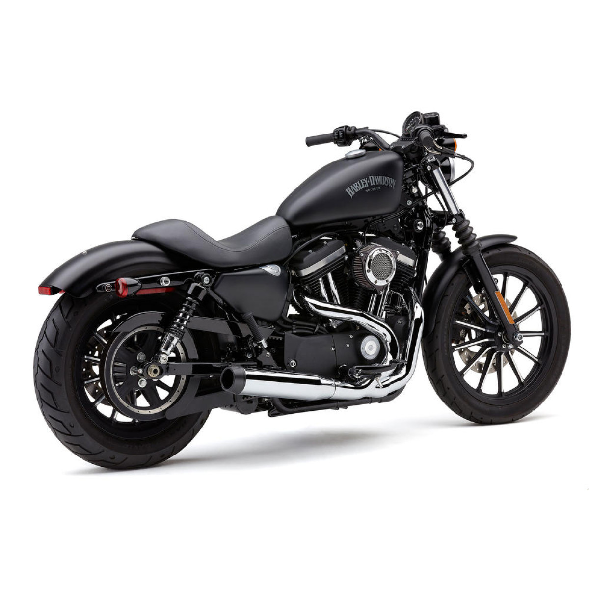 Uses equal-length exhaust headers mated to a chrome cone megaphone muffler Collector is one-of-a-kind that is placed in front of the footpeg This design is the most efficient mating of exhaust gases to help generate more power Rear cylinder header pipe runs forward and wraps around the timing cover for a sleek look Improves oil dipstick clearance 4-inch machined aluminum exhaust tip is powdercoated black and has an etched Cobra logo Exhaust tip's reverse cone shape complements the upswept cone muffler Chrome full-length heat shields Made in the U.S.A.
