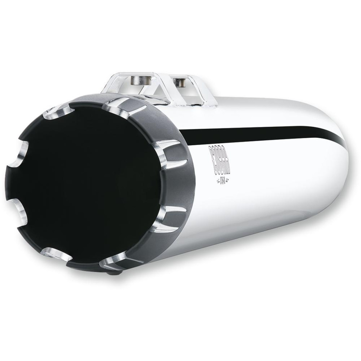 PowerPort crossover makes for a significant power increase from just off idle to redline, which leads to a deep, aggressive exhaust tone PowerPort increased power and overall performance by providing superior scavenging of exhaust gasses over most standard exhaust systems; similar to what you might expect from a 2-into-1 system 1.75" diameter constant velocity cores for exceptional sound and performance Race Pro Tips (RPT) design is adapted from Cobra's Race Pro 4" mufflers; the full-system heat shields expand in size from 2.5" to 2.75" at the system ends Exhaust tips mimic the machined Race Pro Tips; held in place with 12-point bolts Chrome exhausts feature satin black exhaust tips Black exhausts feature machined aluminum clear-coated exhaust tips