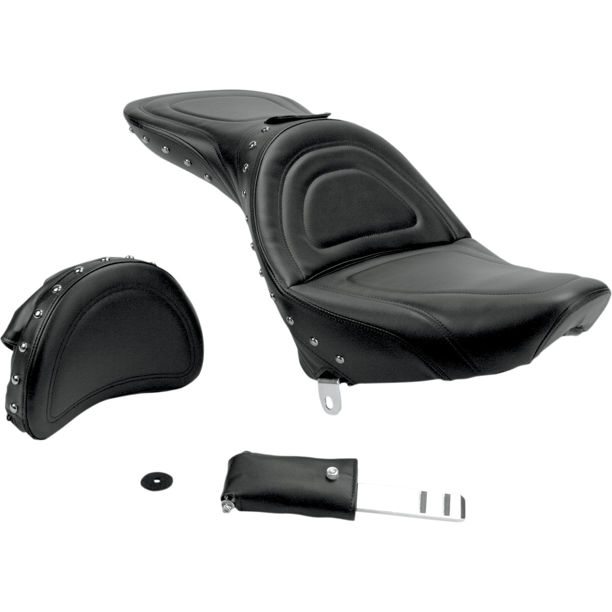 Designed and contoured for two-up touring comfort; match all studded saddlebags and luggage Split-cushion design separates seating surface from lumbar support, reducing tailbone and back pressure SaddleGel™ in both driver and passenger areas increases comfort during trips of any length Supple SaddleHyde™ offers a combination of comfort, glove-soft leathery feel and weather-resistant, no-maintenance good looks Also feature 1/2" chrome-plated brass studs that follow a special stitch pattern Made in the U.S.A.