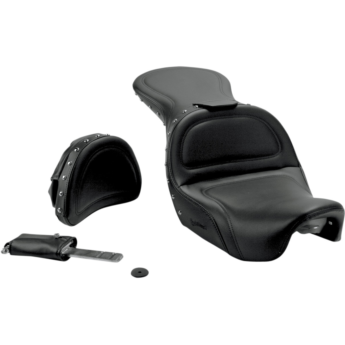 Designed and contoured for two-up touring comfort; match all studded saddlebags and luggage Split-cushion design separates seating surface from lumbar support, reducing tailbone and back pressure SaddleGel™ in both driver and passenger areas increases comfort during trips of any length Supple SaddleHyde™ offers a combination of comfort, glove-soft leathery feel and weather-resistant, no-maintenance good looks Also feature 1/2" chrome-plated brass studs that follow a special stitch pattern Made in the U.S.A.