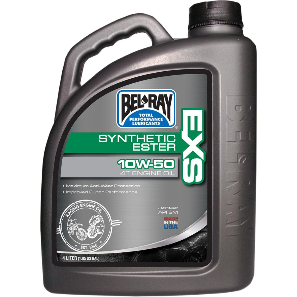 EXS Engine Oil 10W-50 Uses the finest quality synthetic hydrocarbon and ester base fluids Also combined with unique extreme pressure, anti-wear additives and shear-resistant VI improvers Meets the demands of high-performance applications Lowers engine temperatures and increases horsepower Meets or exceeds API SM and JASO MA2 requirements Also works with air-cooled/liquid-cooled 4-stroke engines and wet clutches Liter bottles, 12 per case, or 4 liter bottles, four per case; sold each