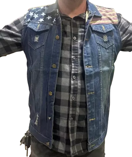 Farkkuliivi jossa joustoa jonkin verran 80% puuvillaa ja joustavaa keino ainetta 20%. Niukat koot. Kuvissa L koko ja kuski L kokoinen, eikä mahdollista laittaa nappeja kiinni.