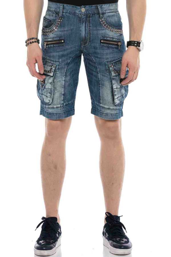 Farkkushortsit reisitaskuilla, Cipo & Baxx. Edessä farkkutaskujen alareunassa koristeniittejä, ja lisäksi vetskataskut reisitaskujen yläpuolella. Materiaali 98 % puuvilla, 2 % elastaani.