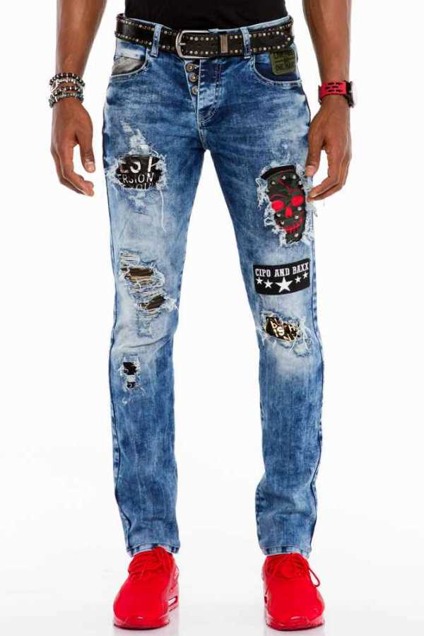 Farkut, Be The Best, Cipo & Baxx. Nappifarkut, väri Blue Denim. Farkut näyttävillä yksityiskohdilla: Edessä napitus vinottain, repeämiä, metallinhohtoa, kalloja, niittejä jne. Takana reilunkokoiset taskut, sekä muotosaumat. Farkuissa kuusi vyölenkkiä, joista mahtuu max. 50 mm leveä vyö. Materiaali 98 % puuvillaa ja 2 % elastaania, hienopesu.