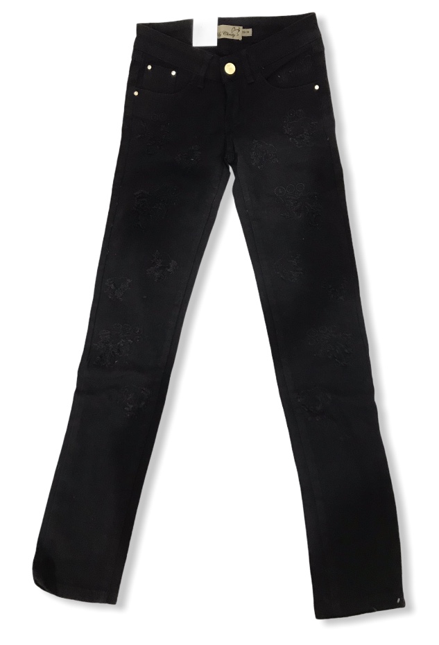 Farkut My Christy, musta stretch-farkku. Slimfit, low waist. Farkkujen etulahkeissa, reidestä polven alapuolelle koristetikkauksia, joiden sisällä viiltoja. Reisien kohdalla viiltojen alta paljastuu mustavalkoinen kangas housujen venyessä tiukemmalle. Housun takaosassa vain muutama koristetikkaus taskuissa ja yläreisissä, mutta viiltoja ei takana ole. Materiaali 95 % puuvilla, 5 % elastaani, hienopesu.