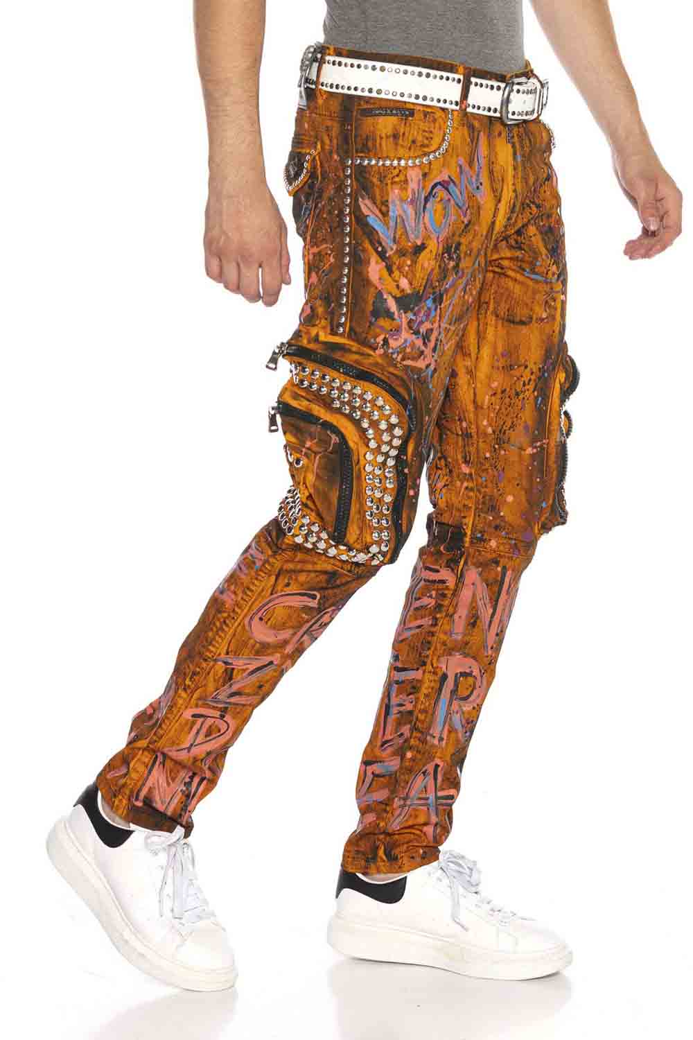 Farkut, oranssit niitti farkut maalauksilla ym... 98% cotton ja 2% elastaania lisäämään joustoa. Niittejä ja väriä piisaa. Metallinen pääkallo leveässä vyölenkissä Reisitaskut tuplana molemmissa lahkeissa joissa jämäkät vetoketjut.