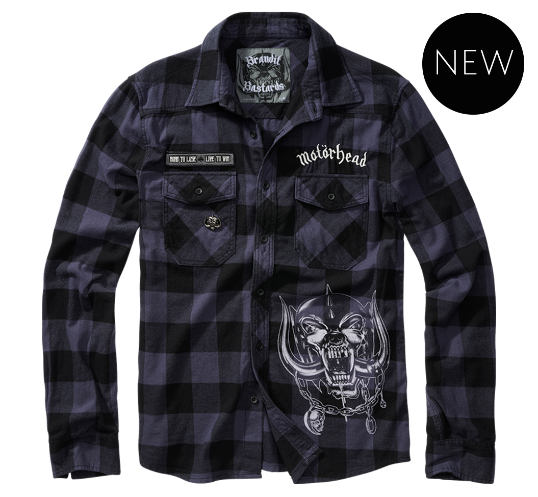Flanellikauluspaita, Motörhead. Ruudullinen kauluspaita, siniharmaa-musta. Näyttävä, lämmin kauluspaita, erittäin mukava päällä ja mikä parasta, kaikilla herkuilla höystettynä ! Nappiläpälliset rintataskut, edessä napit. Vasemman rintataskun yläpuolella valkoinen brodeerattu Motörhead-teksti, oikean rintataskun yläpuolella kangasmerkki, jossa teksti "Born to Lose, Live to Win" ja oikeassa rinnassa myös Motörhead-pinssi. Vasemmassa helmassa upea painatus, iso valkoinen Motörhead-logo. Takakaarrokkeessa on musta brodeerattu Motörhead-teksti. Kokovalikoima M-7XL. Suora malli, materiaali 100 % puuvillaa.