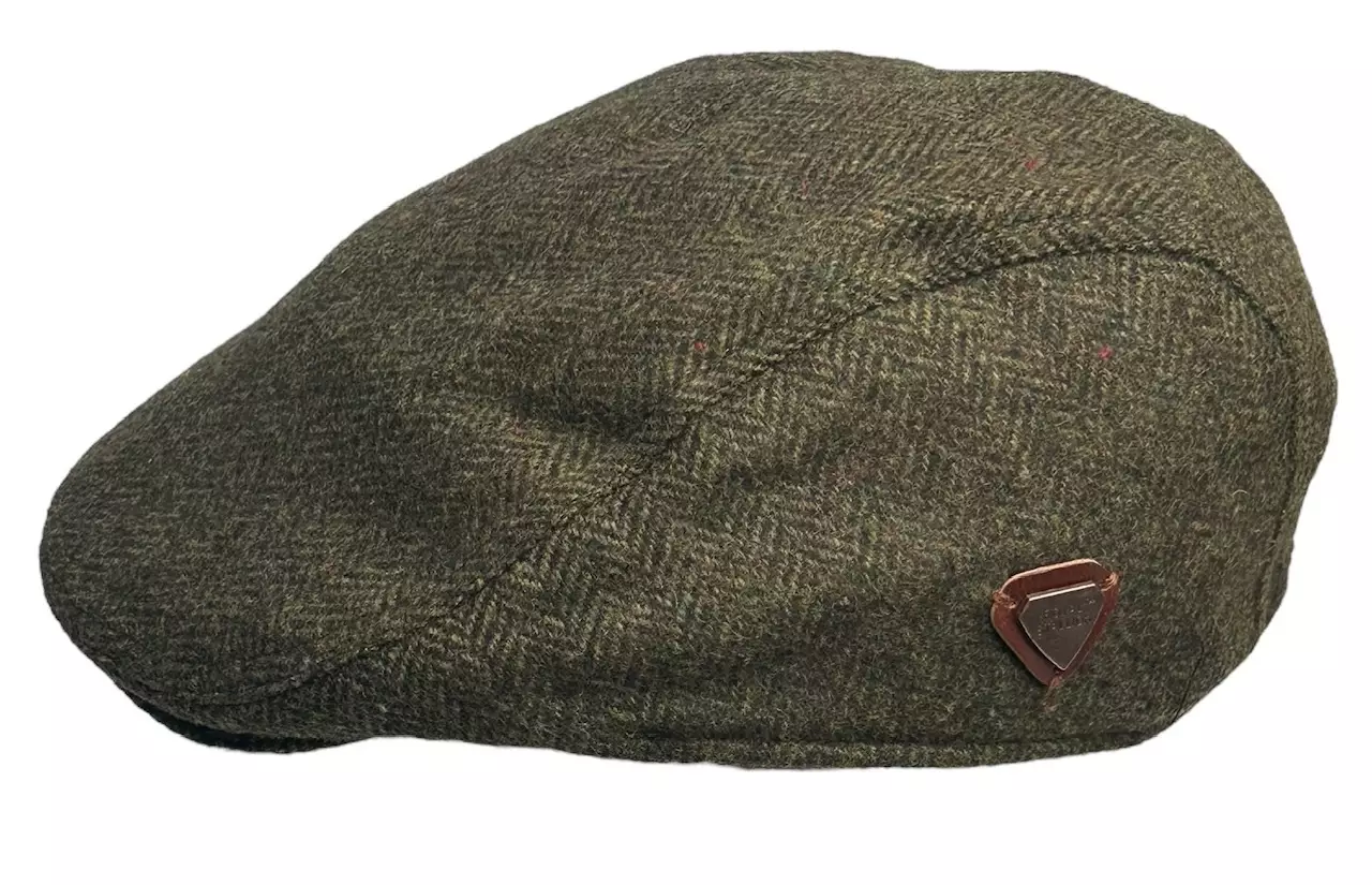 Flatcap Green Herringbone. Vihreä Tweed-lätsä 30 % villaa, 60 % polyesteria, 10 % sekoitetta.