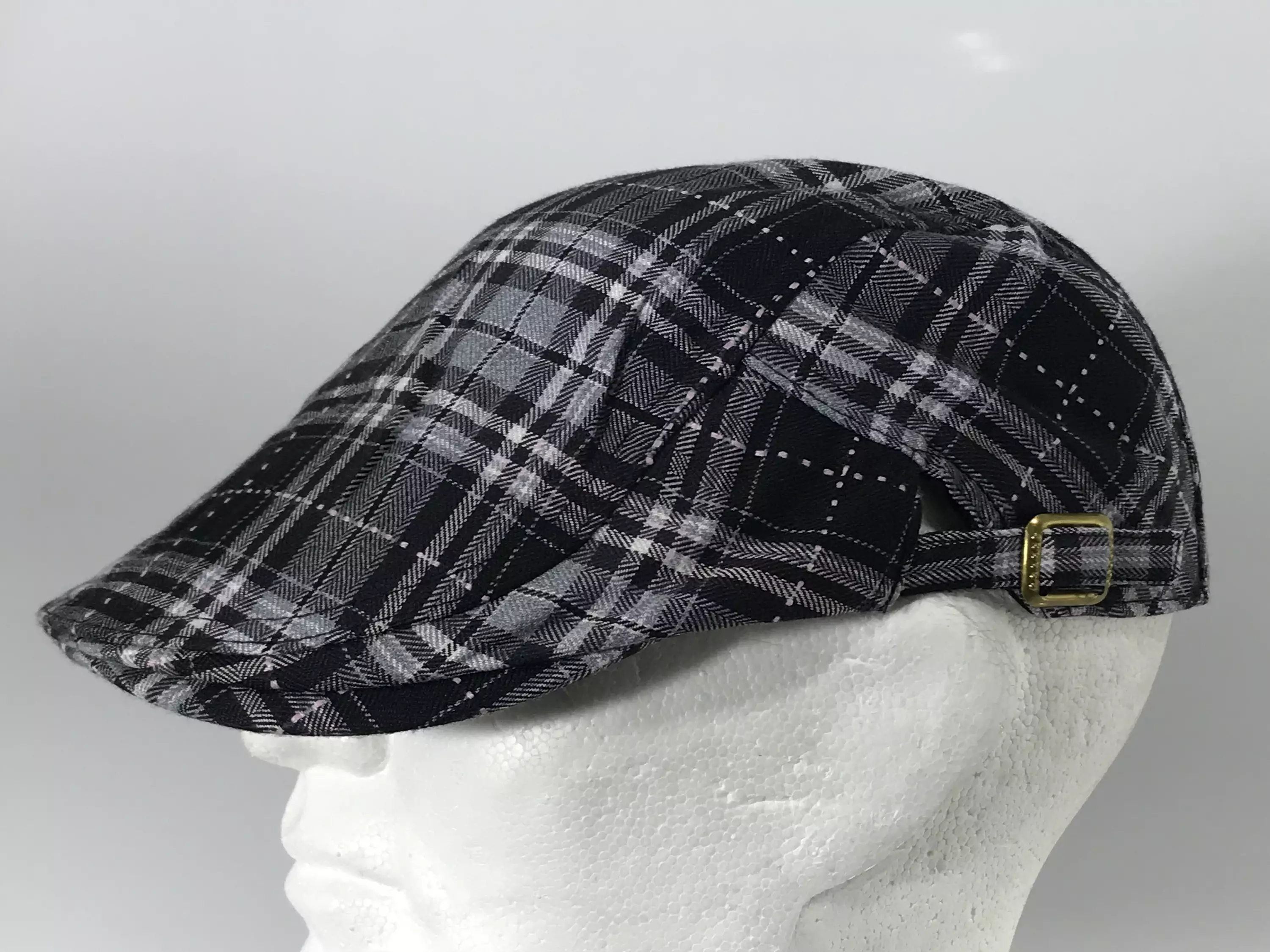 Flatcap, mustavalkoruutu. Mustavalkoruutuinen flatcap, jossa seassa hennosti vaaleanpunaista. Sivuilla säätömahdollisuus.