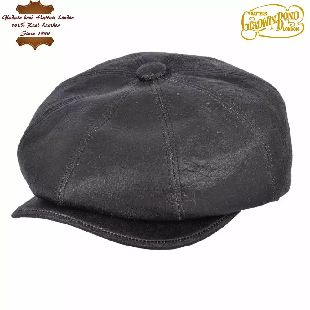 Flatcap vintagelook nahkalätsä, musta. Kuluneen näköiseksi harjattu, kahdeksanpaneelinen "Newsboy" -lätsä lampaannahkaa.