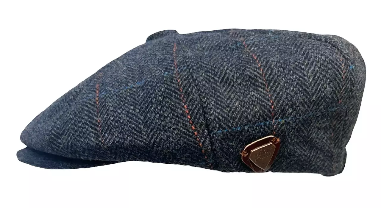 Flatcap Tweed, tummansininen villasekoite. Onesize, 8-paneelinen, lipassa neppi. Materiaali 60 % villaa, 30 % polyesteria, 10 % sekoitetta.