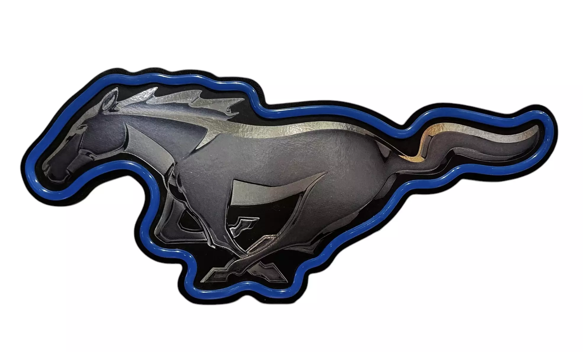 Ford Mustang LED-valo USB. Valotaulun ympäri kiertää sininen LED-valokaapeli. USB-johdossa on valokatkaisija. Valotaulun takaosassa on ripustusruuveille paikat (ruuvit eivät sisälly pakkaukseen)