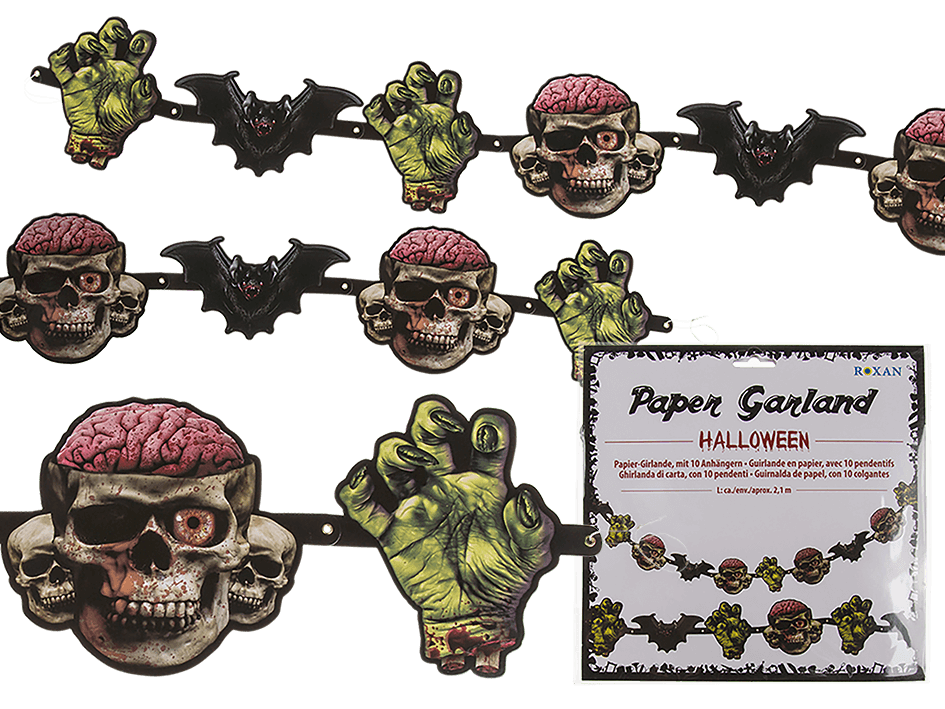 Halloween-kauhuköynnös 2,1 m. Pahvikuvissa lepakot, pitkäkyntiset monsterikädet ja pääkallot valmiina pelottelemaan juhliesi vieraat. Pahvikuvia kaikkiaan 10 kpl ja köynnöksen mitta 2,1 metriä.