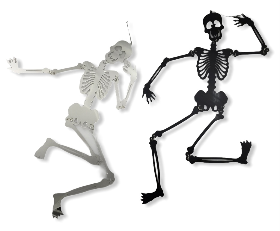 Halloween-luuranko 48 cm. Valikoimissa musta tai peilimäinen hopea 48 cm pitkä, hauska luuranko. Nivelten kohdalla metallirenkaat, joten heiluttelemalla luurankoa luut heiluvat vapaasti.