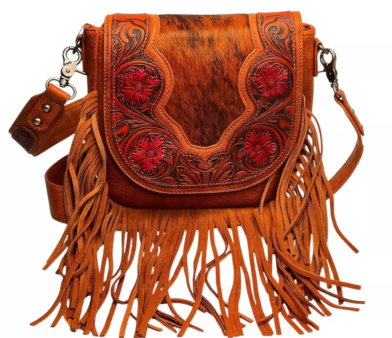 Hapsullinen käsilaukku, ruskea cow. Laukun mitat 23 x 22 x 7 cm. Ruskea käsilaukku aidolla naudannahkasomisteella ja aidoilla nahkahapsuilla. Laukun läppää koristavat myös punertavat kukkaprintit. Läpän alla on vetoketjullinen laukkuosasto, jonka vuorissa on lisäksi kaksi sisätaskua pikkutavaroille, toinen on suljettavissa vetoketjulla. Myös laukun takaosassa on yksi vetoketjullinen tasku. Olkahihna on irroitettavissa hakasilla. Materiaali polyuretaani ja nahka, vuori polyesteria.