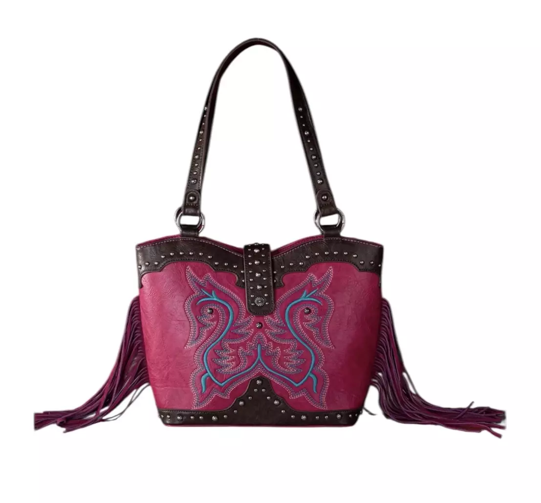 Hapsullinen Montana West-Laukku, pinkki. Nahkahapsullinen iso laukku käsikahvoilla, upeilla yksityiskohdilla ! Laukun etupuoli on koristeltu upein kirjailuin ja koristeniitein. Laukkuosasto avataan vetoketjulla. Laukun takapuolella on pystysuuntainen vetoketjutasku ja yksi paikkatasku. Vuorissa on molemmin puolin laukkua myös sisätaskut: yksi iso vetoketjutasku, sekä kaksi avotaskua. Laukun mitat 38 x 27 x 13 cm. Turkoosissa polyuretaanilaukussa ruskeat, aidot nahkahapsut, vuori on polyesteria.