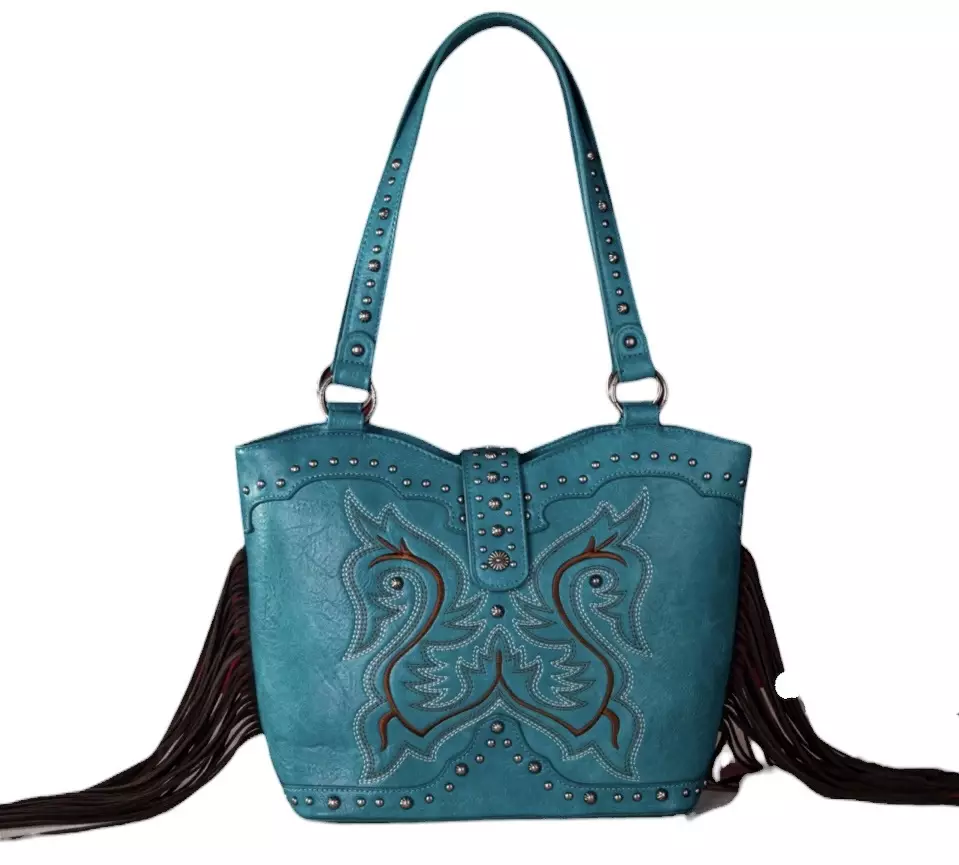 Hapsullinen Montana West-Laukku, turkoosi. Nahkahapsullinen iso laukku käsikahvoilla, upeilla yksityiskohdilla ! Laukun etupuoli on koristeltu upein kirjailuin ja koristeniitein. Laukkuosasto avataan vetoketjulla. Laukun takapuolella on pystysuuntainen vetoketjutasku ja yksi paikkatasku. Vuorissa on molemmin puolin laukkua myös sisätaskut: yksi iso vetoketjutasku, sekä kaksi avotaskua. Laukun mitat 38 x 27 x 13 cm. Turkoosissa polyuretaanilaukussa ruskeat, aidot nahkahapsut, vuori on polyesteria.