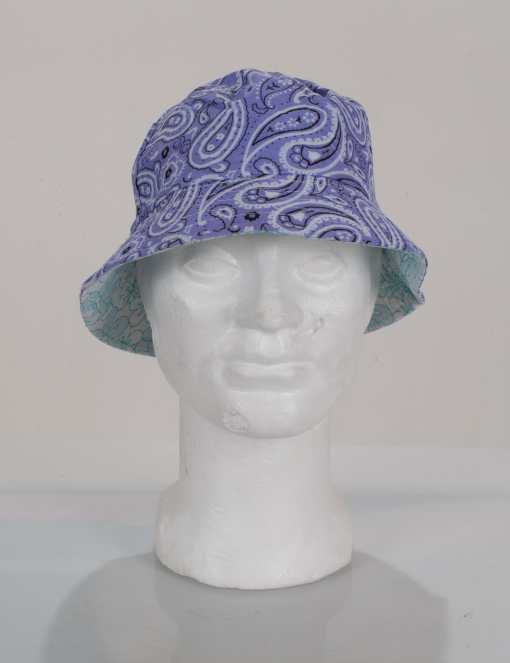 Hattu, käännettävä kesähattu, joka on toiselta puolelta lila ja toiselta sinivalkoinen.