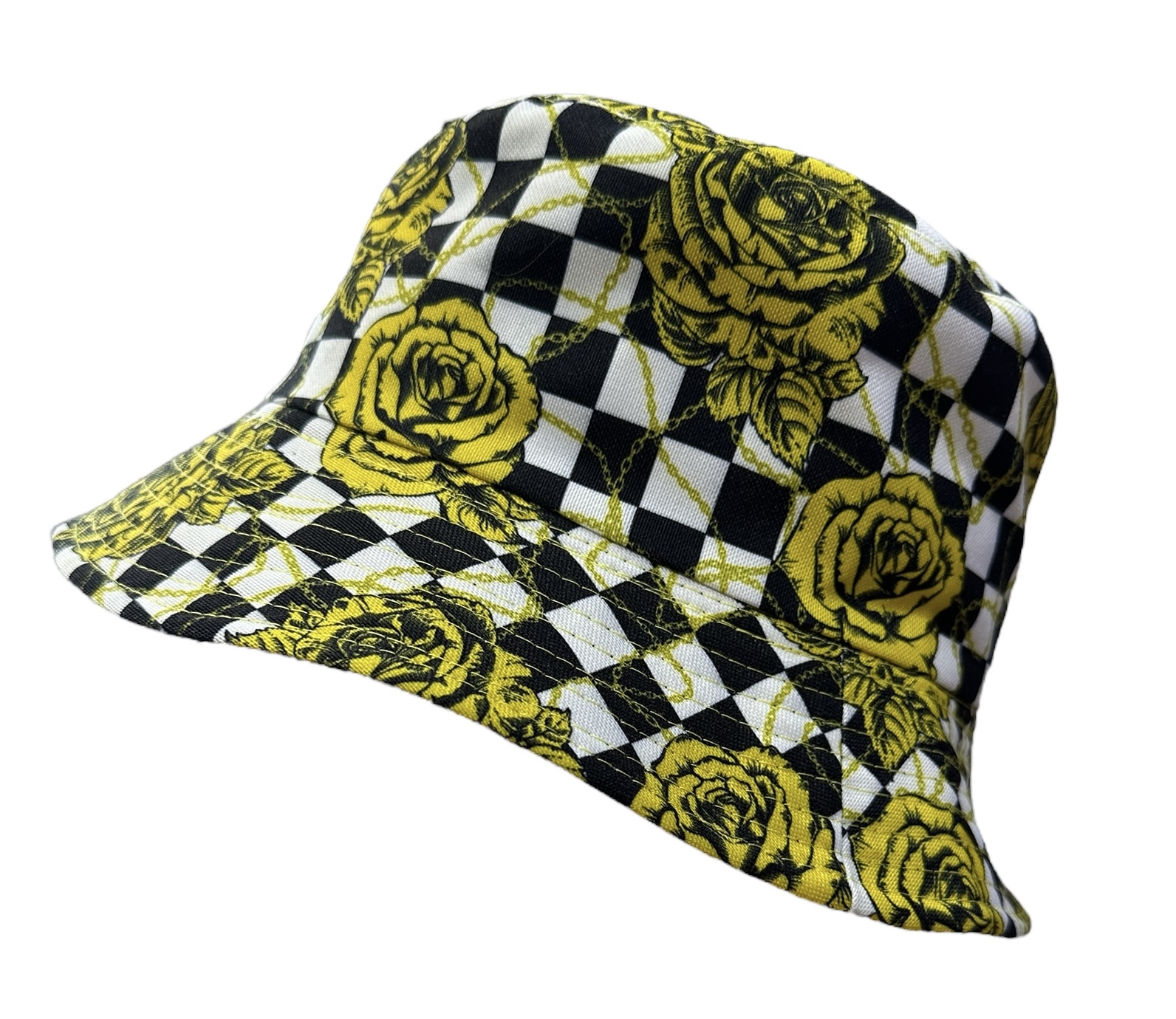 Hattu, Kalastajahattu, Keltaruusu. Kankainen lierihattu, jonka voi kääntää kumminpäin tahansa. Toinen puoli hatusta on kokonaan musta, kääntöpuolella keltaiset ruusut ja ralliruutu. Materiaali 100 % puuvilla.
