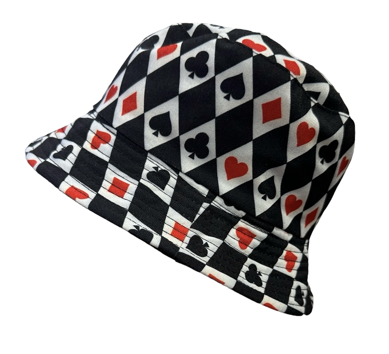 Hattu, Kalastajahattu, Pelikortit. Kankainen lierihattu, jonka voi kääntää kumminpäin tahansa. Toinen puoli hatusta on kokonaan musta, toinen puoli pelikortin maasymboleja, ruutu, risti, hertta ja pata. Materiaali 100 % puuvilla.