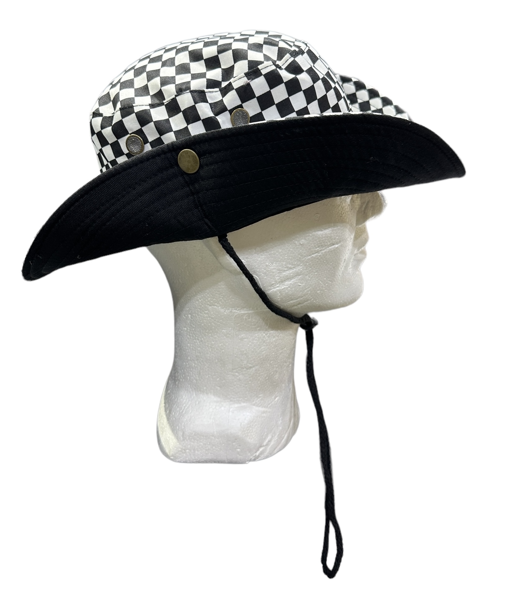 Hattu, Kangashattu, ralliruutu. Kangashattu lierillä, 100 % puuvillaa. Lierin saa nepeillä kiinni hattuosaan. Hatussa myös nyöri, jossa kiristin, näin hattu ei karkaa tuulisellakaan säällä.