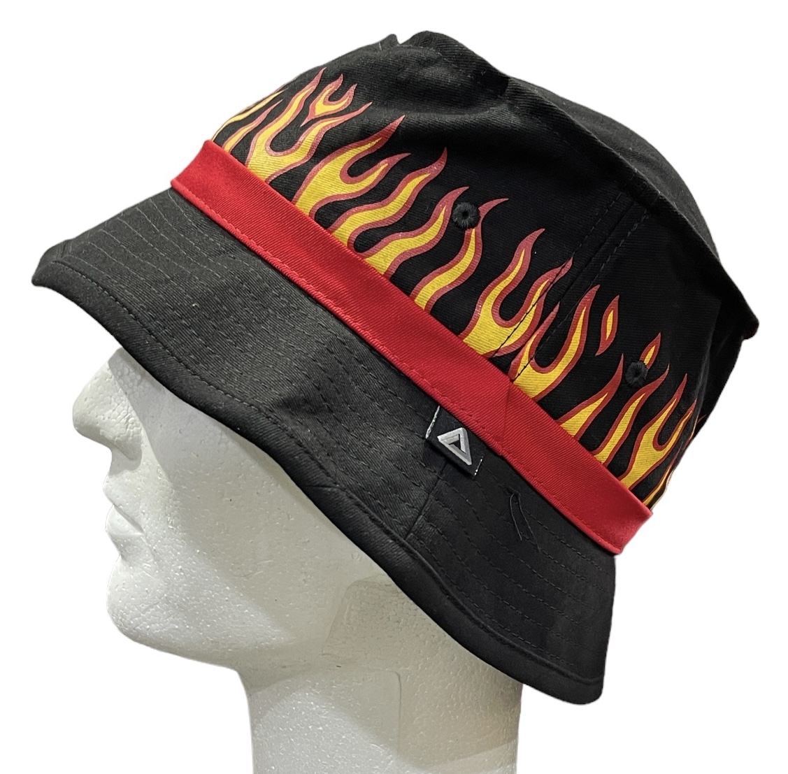 Hattu, Liekkireunus. Musta kangashattu punaisella koristenauhalla ja hatun reunaa kiertävällä liekkiprintillä. Lierissä koristetikkaukset. Sopii max 58 cm ympärysmitaltaan olevaan päähän.