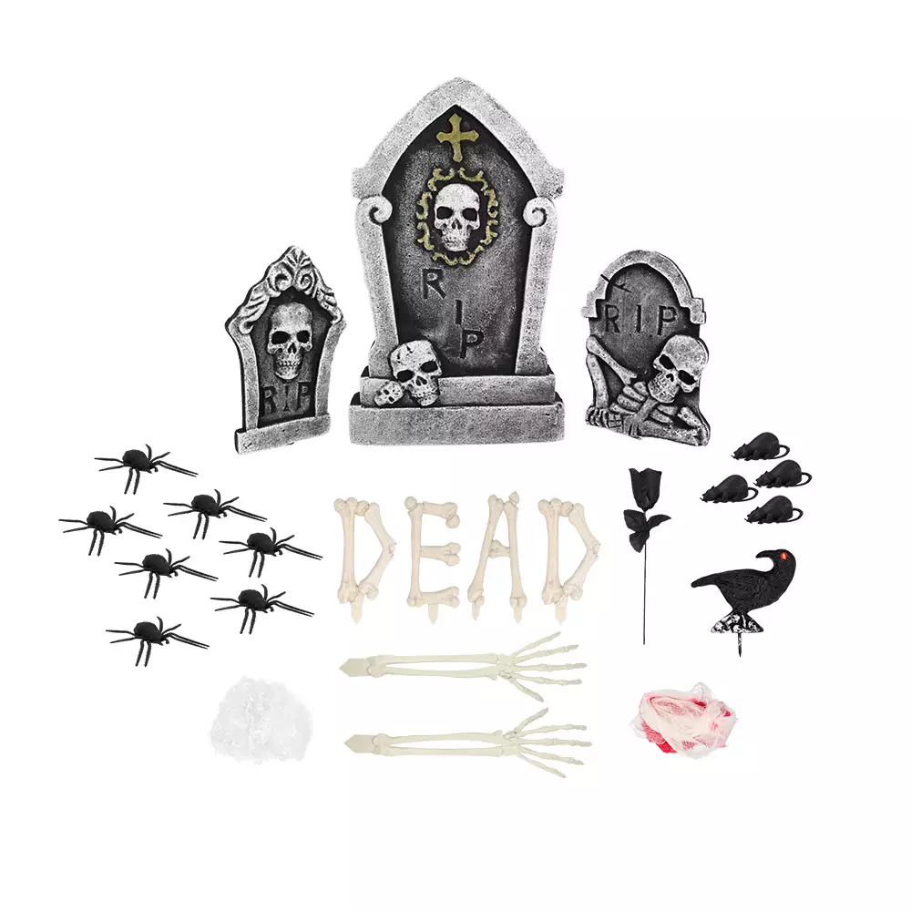 Hautakivi setti, halloween. Kauhurekvisiitta, pakkauksessa asianmukainen kattaus hautapaikan luomiseksi. Sisältö: - kolme erilaista hautakiveä - kaksi luurangon käsivartta - neljä luista muodostuvaa kirjainta DEAD - musta varis - musta ruusu - neljä rottaa - seitsemän hämähäkkiä - verinen kääre - hämähäkinseitti