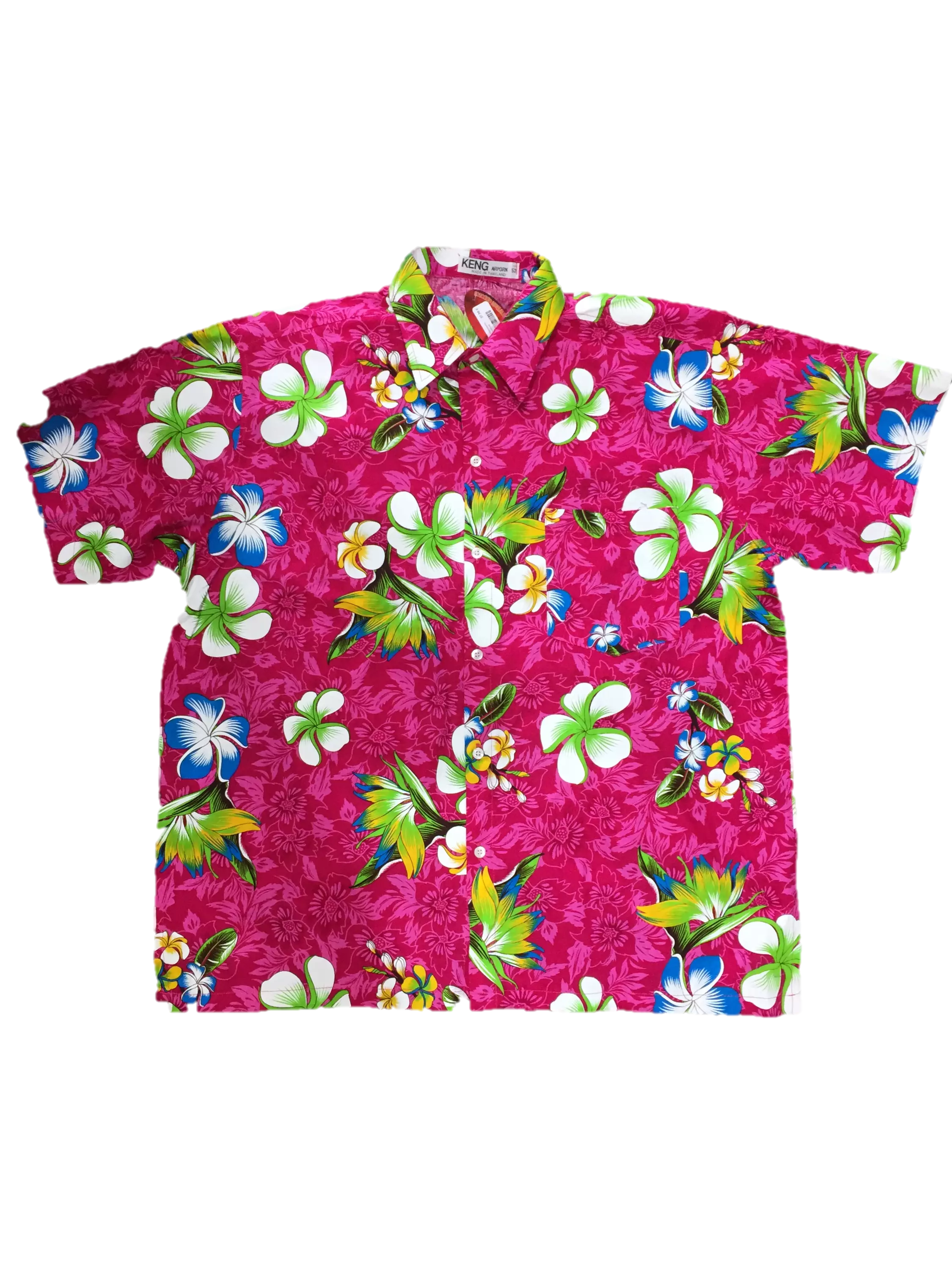 Havaijipaita, Pinkki, valko-vihreät kukat. Havaijipaidan materiaali 100 % puuvillaa. Vahvistetut kaulukset. Napitus edessä. Rintatasku.