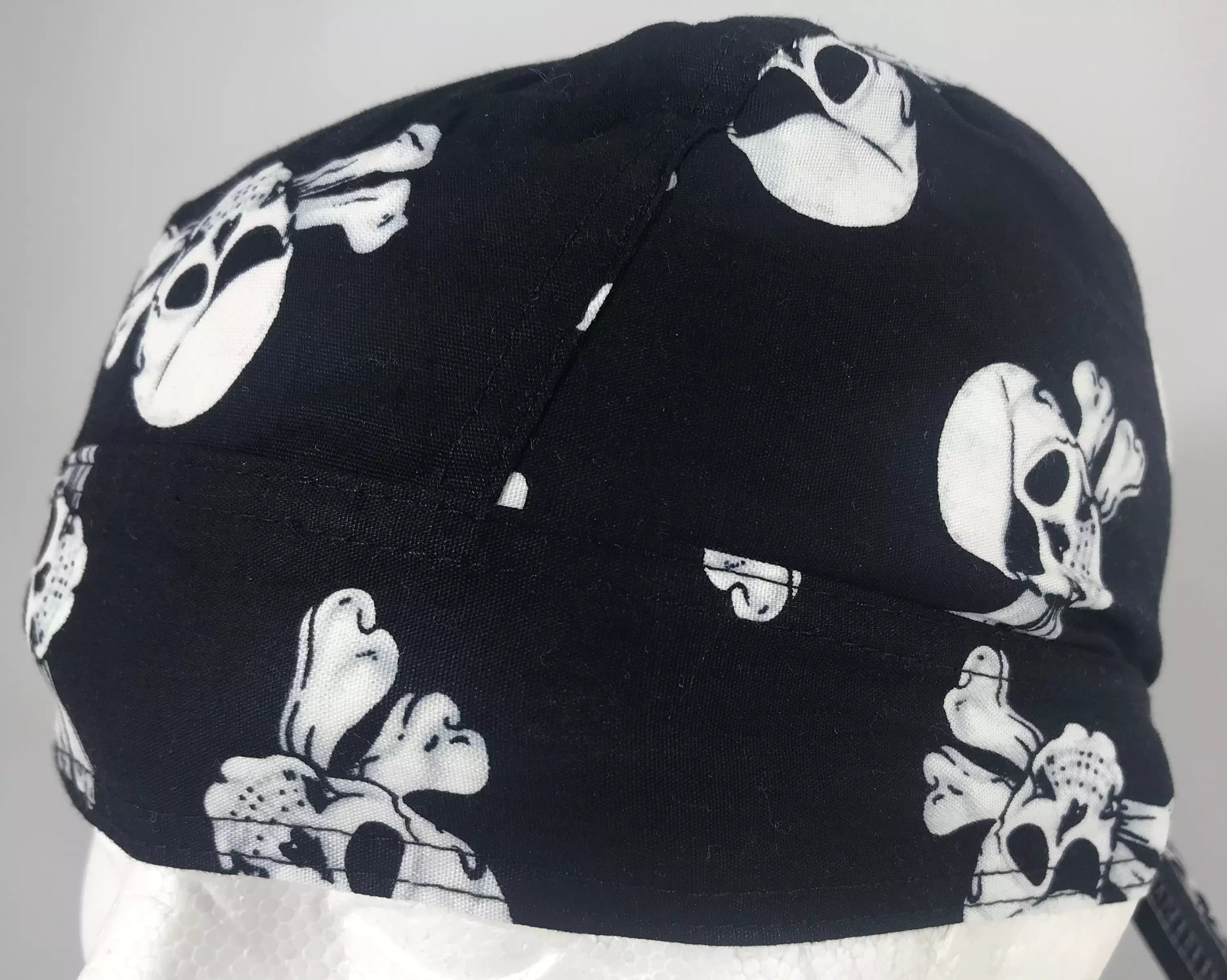 Headwrap, pirateskull. Mustalla pohjalla valkoiset kallot. Muotoonommeltu headwrap huivi. Yksi koko. Solmittavat nauhat takana. 100 % puuvillaa.