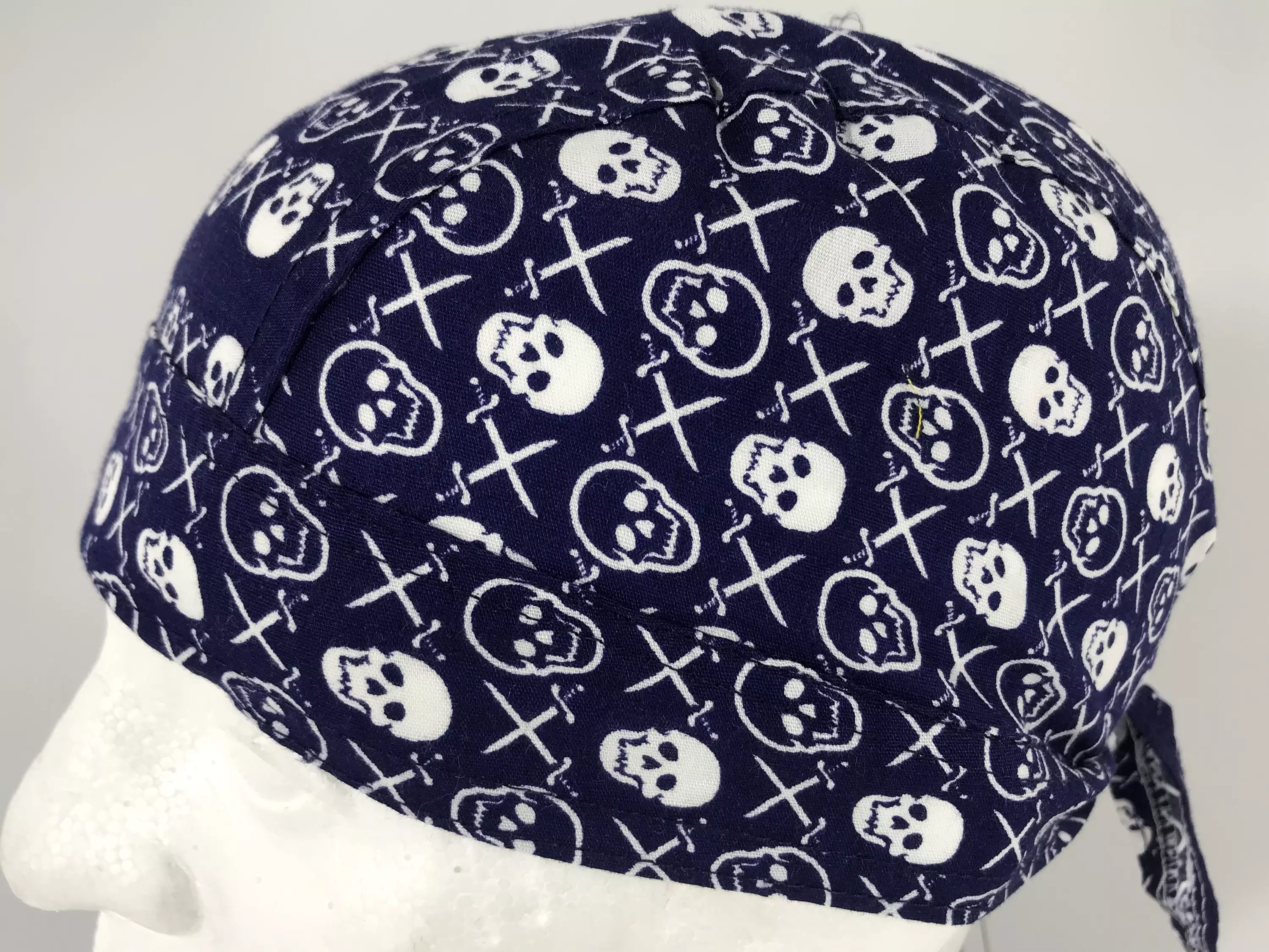 Headwrap, sininen, pikkukallot. Sinisellä pohjalla valkoisia pieniä kalloja.. Muotoonommeltu headwrap huivi. Yksi koko. Solmittavat nauhat takana. 100 % puuvillaa.