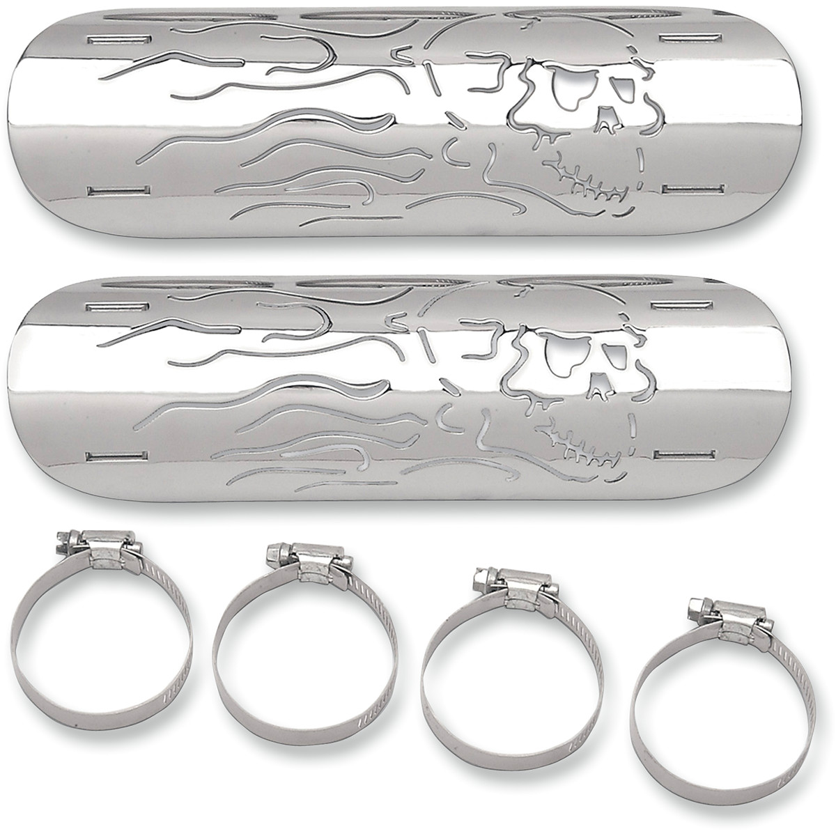 Flaming Skull Heat Shields Measure 10" in length Chrome-plated finish Universal fit for 2" 2-1/4" o.d. exhaust pipes Made in the U.S.A.