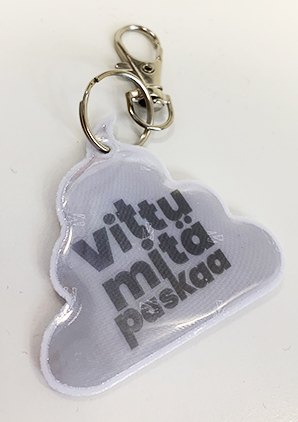 Heijastin Pakkanen. Pehmeä heijastin, jossa teksti painettu molemmin puolin. Heijastin roikkuu riippulenkissä, jonka saa kätevästi kiinnitettyä papukaijahakasella. Nyt näkyy !