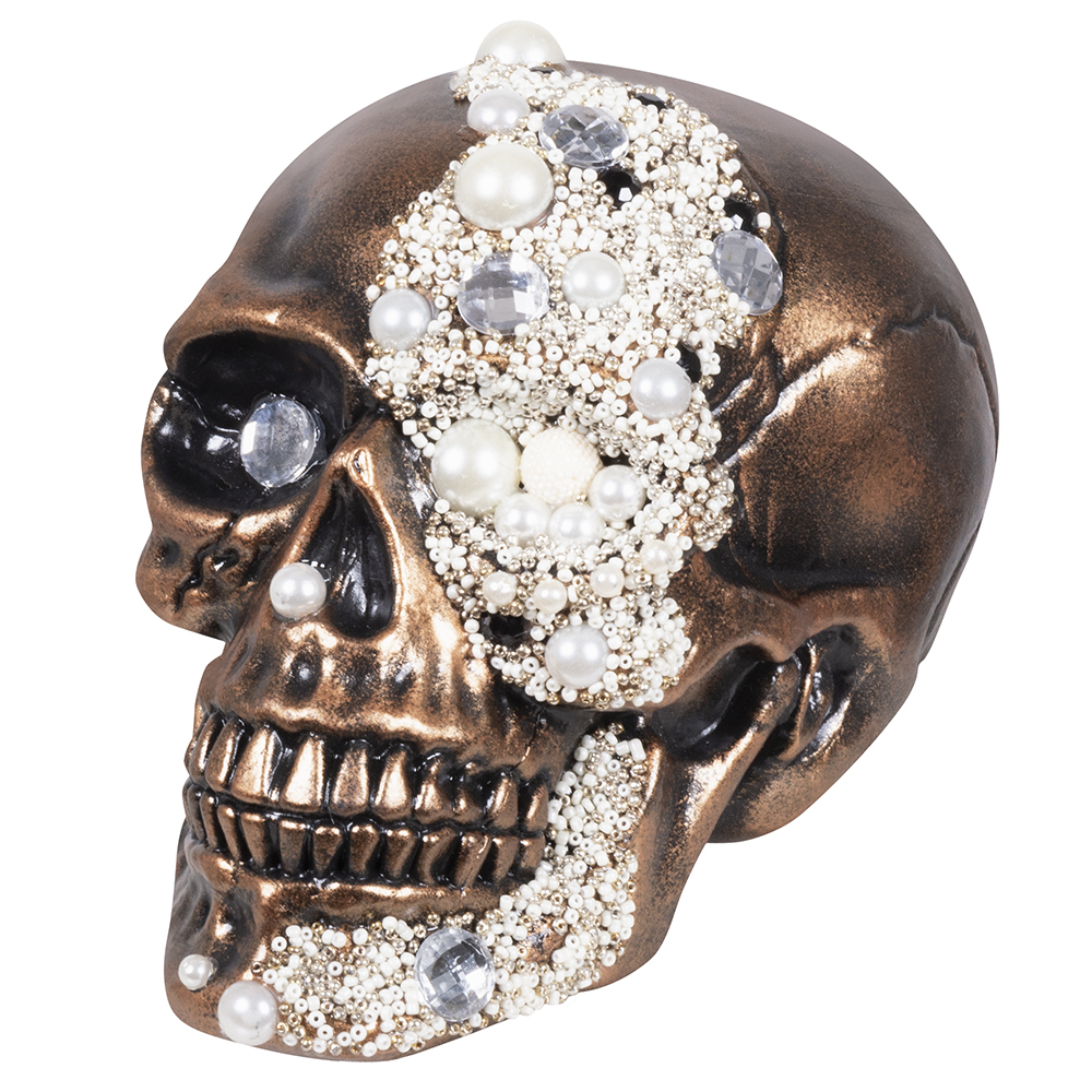 Helmikallo. Pronssinvärinen kallo, kuin suoraan suuren aarrekätkön sisältämästä aarrearkusta. Kallon mitat 16 x 15 x 21 cm ja materiaali muovia, tosin näyttää metallilta.