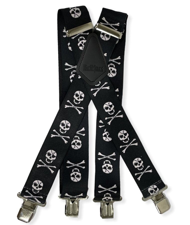 Henkselit, Pirate Skull & Bones, 50 mm. Pääkallo olkaimet neljällä pikaklipsulla, nopea kiiinnittää ja irroittaa. Säädettävä pituus, pisimmillään 121 cm (48"). Made in USA.