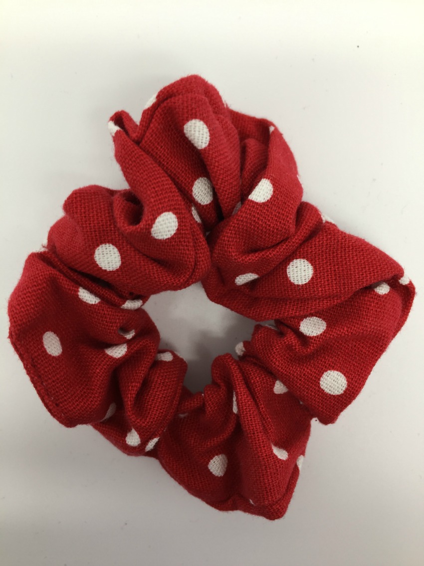 Hiusdonitsi, Polka Dot, punainen. Hiusdonitsi eli scrunchie pilkuilla. Joustavan hiusdonitsin koko n. 10 x 10 cm.