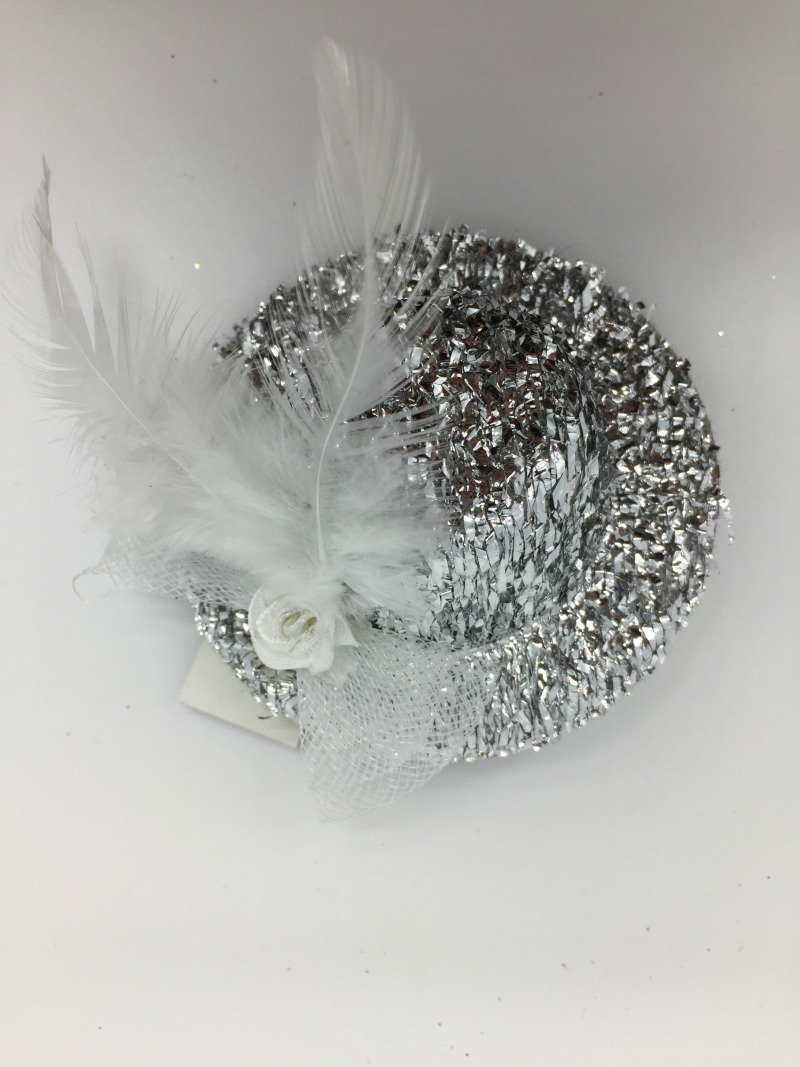 Hiuskoriste, hopea hattu. Hatun halkaisija 8 cm ja korkeus 3 cm. Hatun alapuolella metalliklipsu, jolla hatun saa nätisti hiuksiin kiinni. Erittäin näyttävä hiuskoriste ja kampauksen kruunu. Kukkien ja rusettien ulkonäkö saattaa hieman vaihdella.