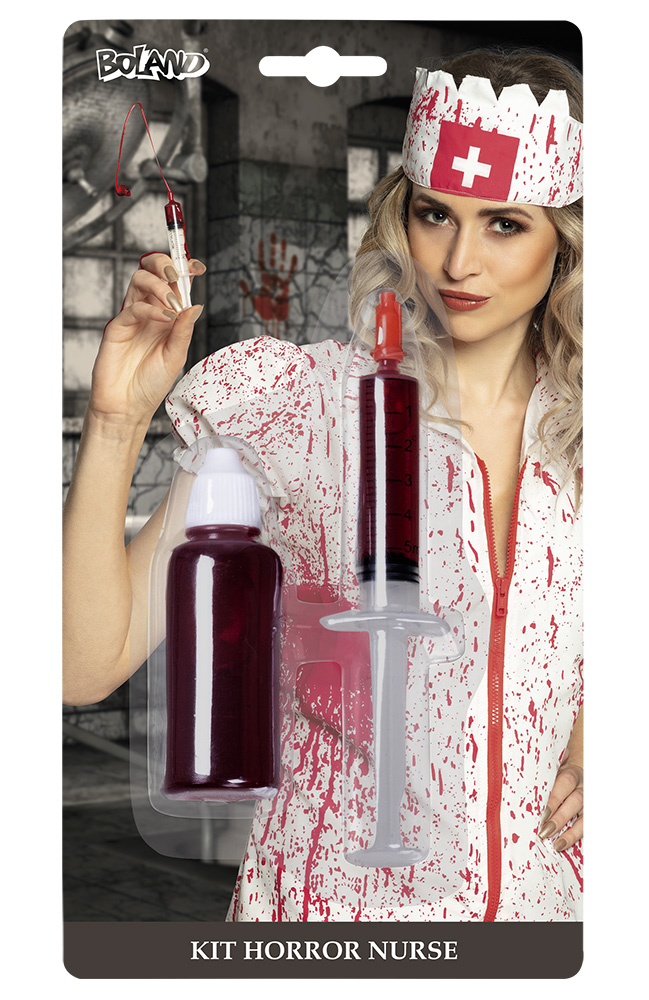 Horror-hoitsun ruisku tekoverellä. Kuka pelkää piikkeejäää...? Ruisku 5 ml ja 28 ml täyttöpullo.