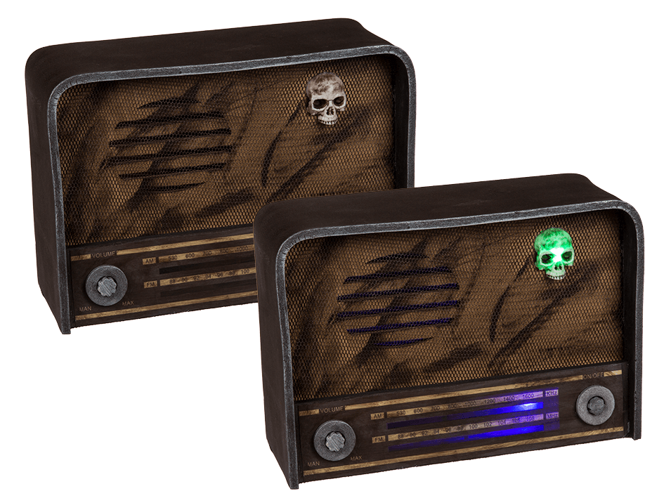 Horror radio, äänellä ja valolla. Rätisevää ääntä pitävä radio, jossa kallo vilkkuu vihreää valoa ja kanavanvalitsin sinistä valoa. Toimii kolmella AAA-paristolla, jotka sisältyvät pakkaukseen. Radion koko on n. 32 x 22 cm, materiaali muovia.