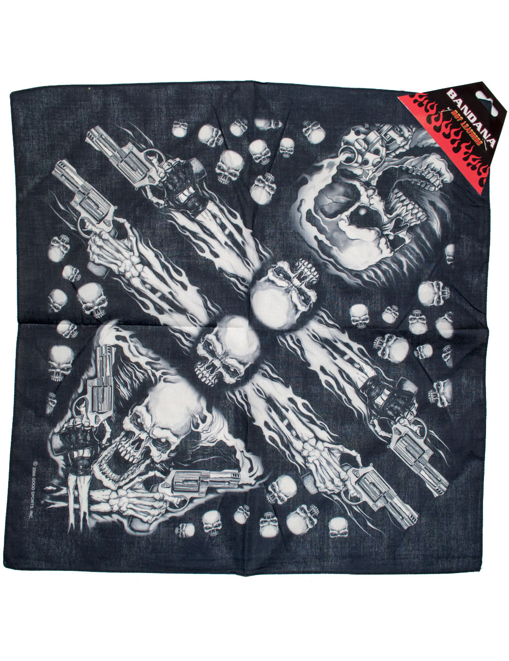 Our signature Assassin / Killer Biker Bandana measures 21"x21" and has two original designs, allowing for wear in multiple ways. Skulls, skulls and more assassin skulls! Various sizes of skulls on one side, with a similar design on the other in addition to larger evil assassin skulls grip smoking handguns right down the middle all in black and white. Wear this style on your head, under your helmet or around your neck to add a little attitude to your biker style!