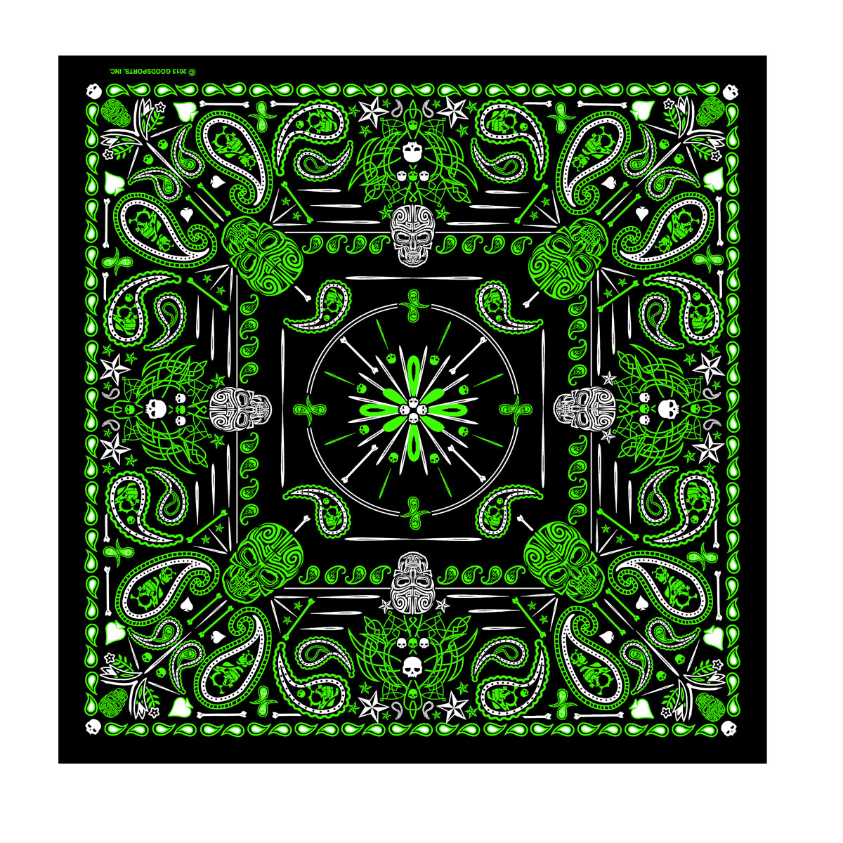 Huivi, Hot Leathers, Skull Green. Green Skull bandana, koko 53 x 53 cm, on tarkoitettu käytettäväksi monella eri tavoin. Voit käyttää tätä huivia moottoripyöräkypärän alla, kasvoilla tai kaulanlämmittimenä.