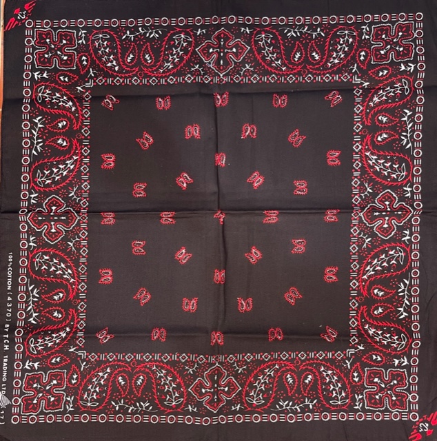 Huivi, musta huivi punaisella kasmir-kuviolla. Huivin koko 50 x 50 cm. Materiaali 100 % puuvillaa.