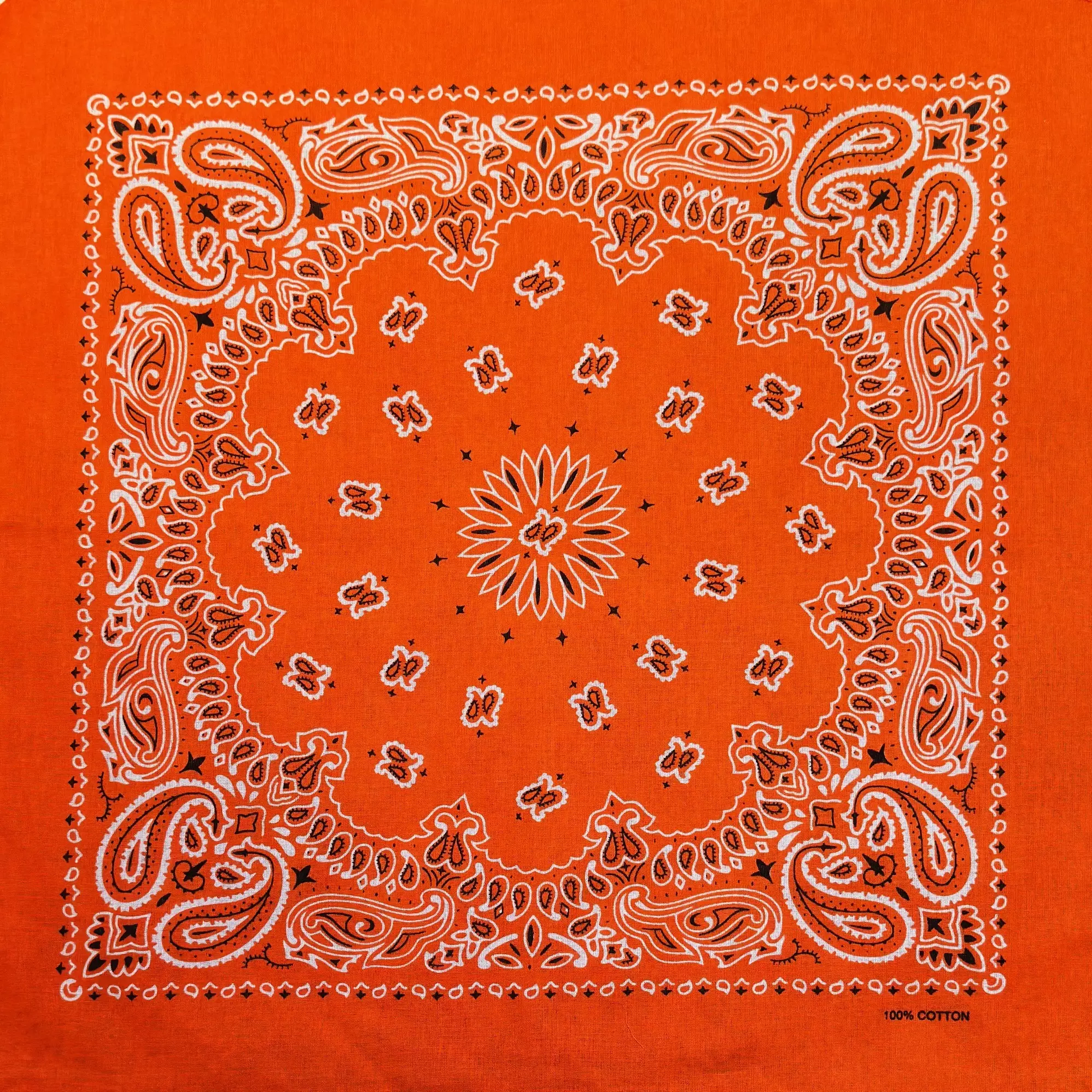 Huivi, oranssi kashmir-kuvio. Mitat 52 x 52 cm. Materiaali 100 % puuvilla.