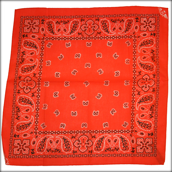 Huivi, oranssi mustilla ja valkoisilla bandana kuvioilla.