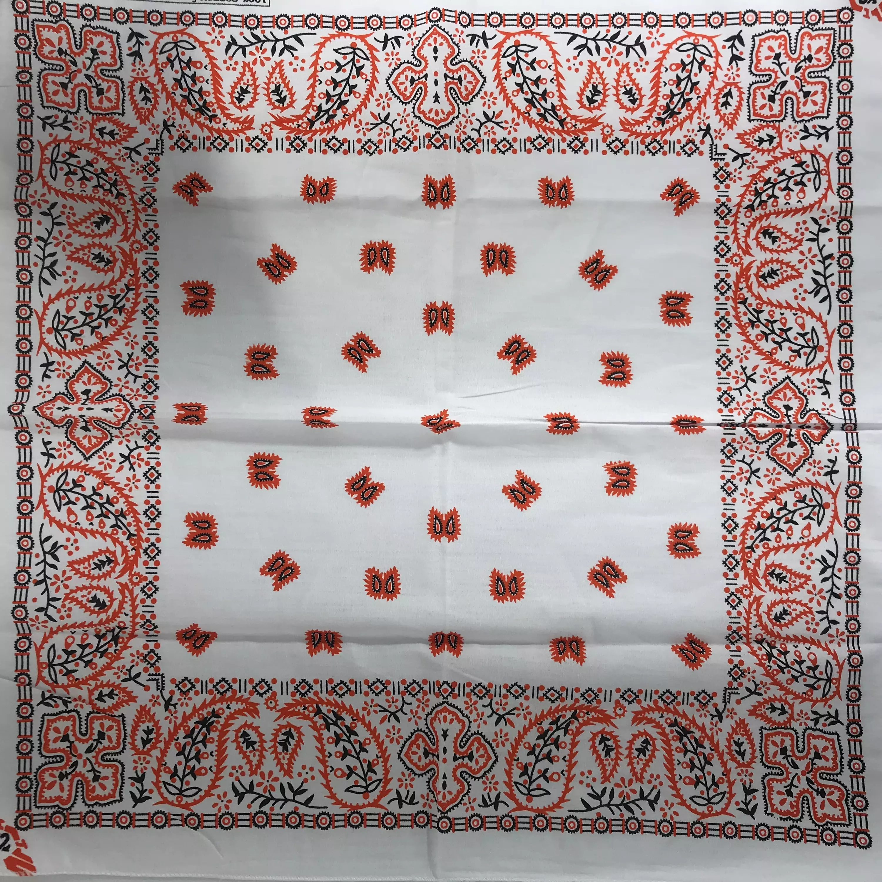 Huivi, valkoinen bandana oranssimustalla kasmir kuviolla. Huivin koko 52 x 52 cm. Materiaali 100 % puuvillaa.