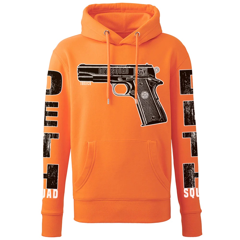Huppari Deth Squad 45, oranssi. Pään yli vedettävä oranssi unisex-huppari. Lämmin, paksu collegemateriaali, jossa pehmeäksi nukattu sisäpinta. Hihansuissa ja helmassa resorit, hupussa paksu nyöri. Hihoissa ja edessä isot printit, edessä kengurutasku. Materiaali 80 % puuvilla, 20 % polyesteri.