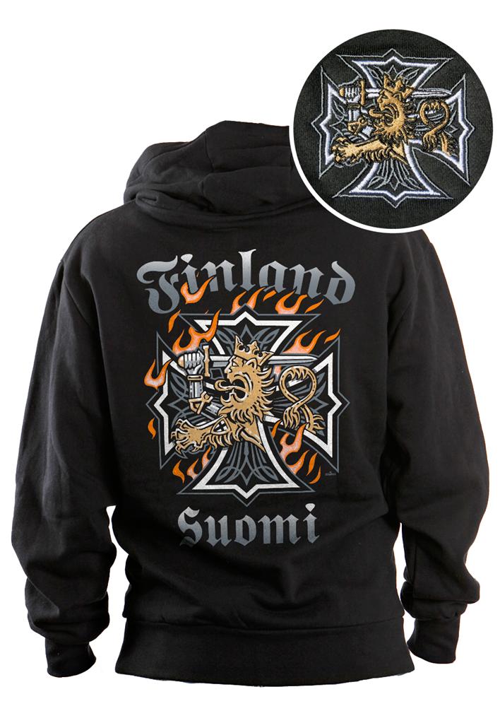 Huppari, Leijona & Maltanristi . Nyt myös lapsille Suomi Finland huppari. Rinnassa brodeeraus, jossa maltanristin sisällä suomileijona. Selässä painettuna teksti Finland Suomi sekä liekkejä, maltanristi ja suomileijona.