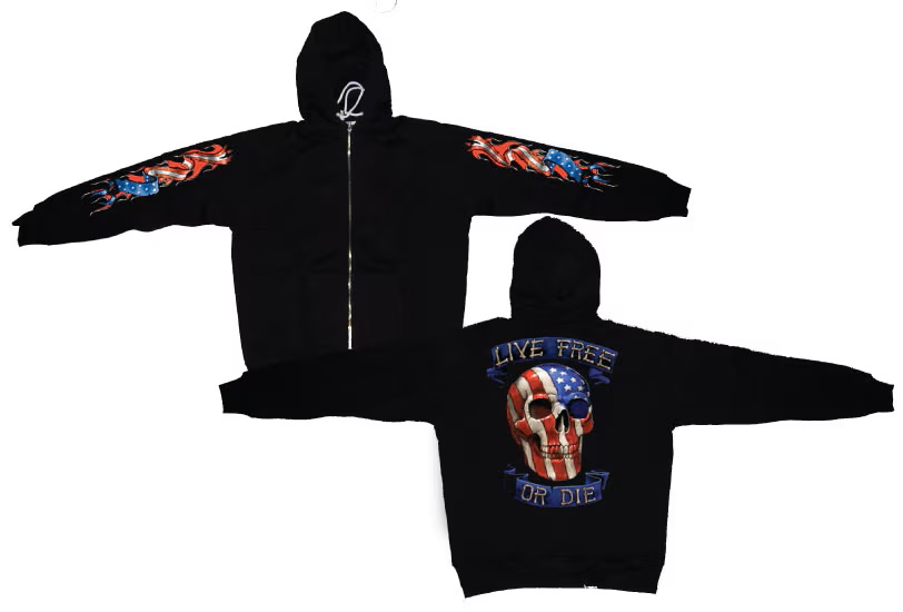 Huppari Live Free Or Die. Musta vetoketjuhuppari, selkä- ja hihaprinteillä.