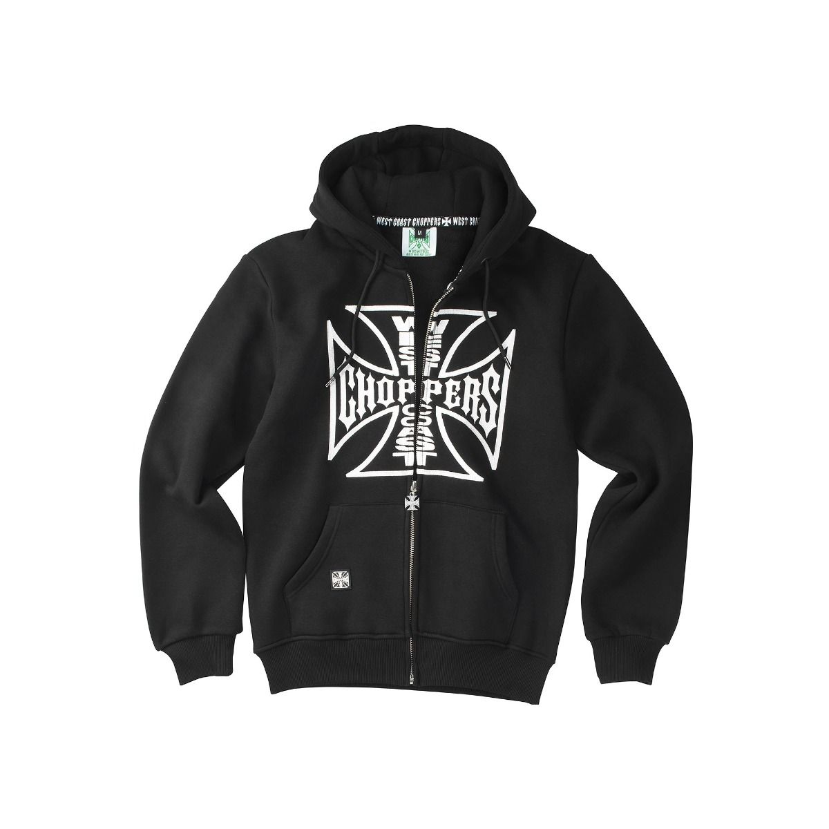 West coast Choppers huppari. Lämmin huppari, jossa sisäpuolella pehmeä harjattu nukkapinta. Resorit hihansuissa ja helmassa, hupussa nyöri ja edessä taskut. Edessä keskellä iso WCC-logo brodeeraus. Materiaali 80 % puuvilla, 20 % polyesteri, hienopesu.